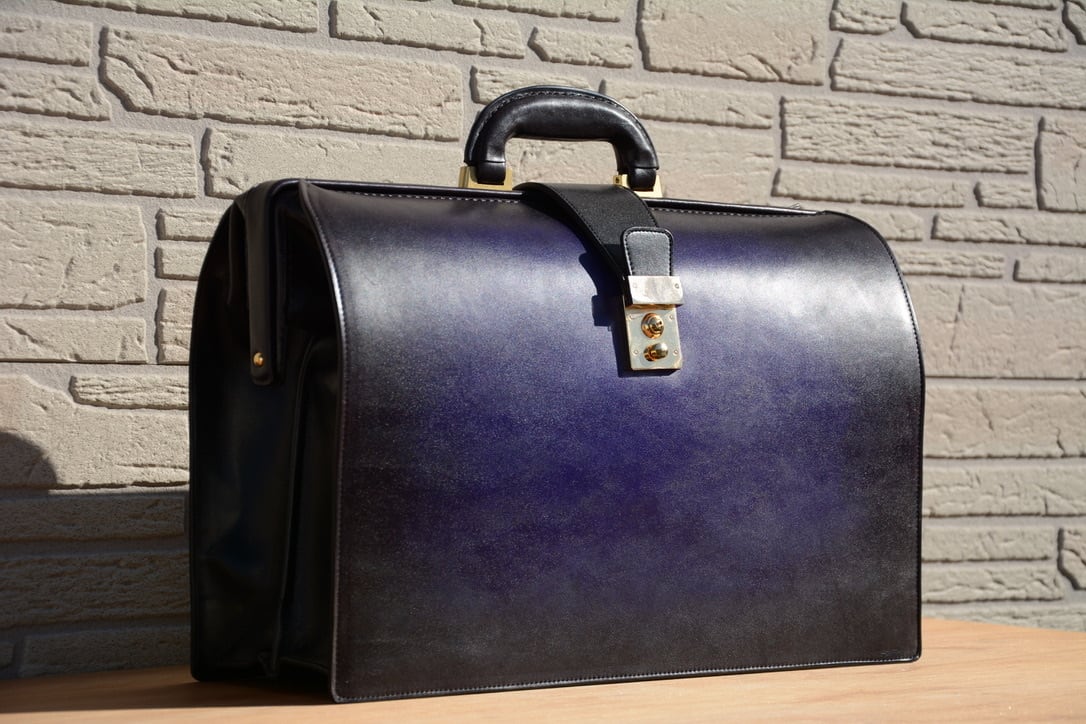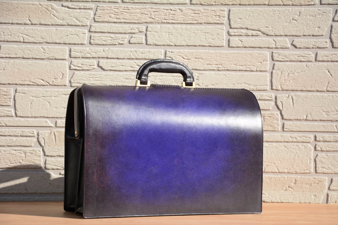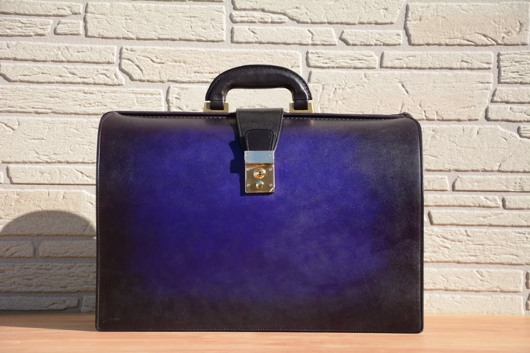 ダレスバッグの堅牢・重厚感、洗練されたイメージは残しつつ、手染めグラデーションを加えたことで一点物感を全面に出しています。